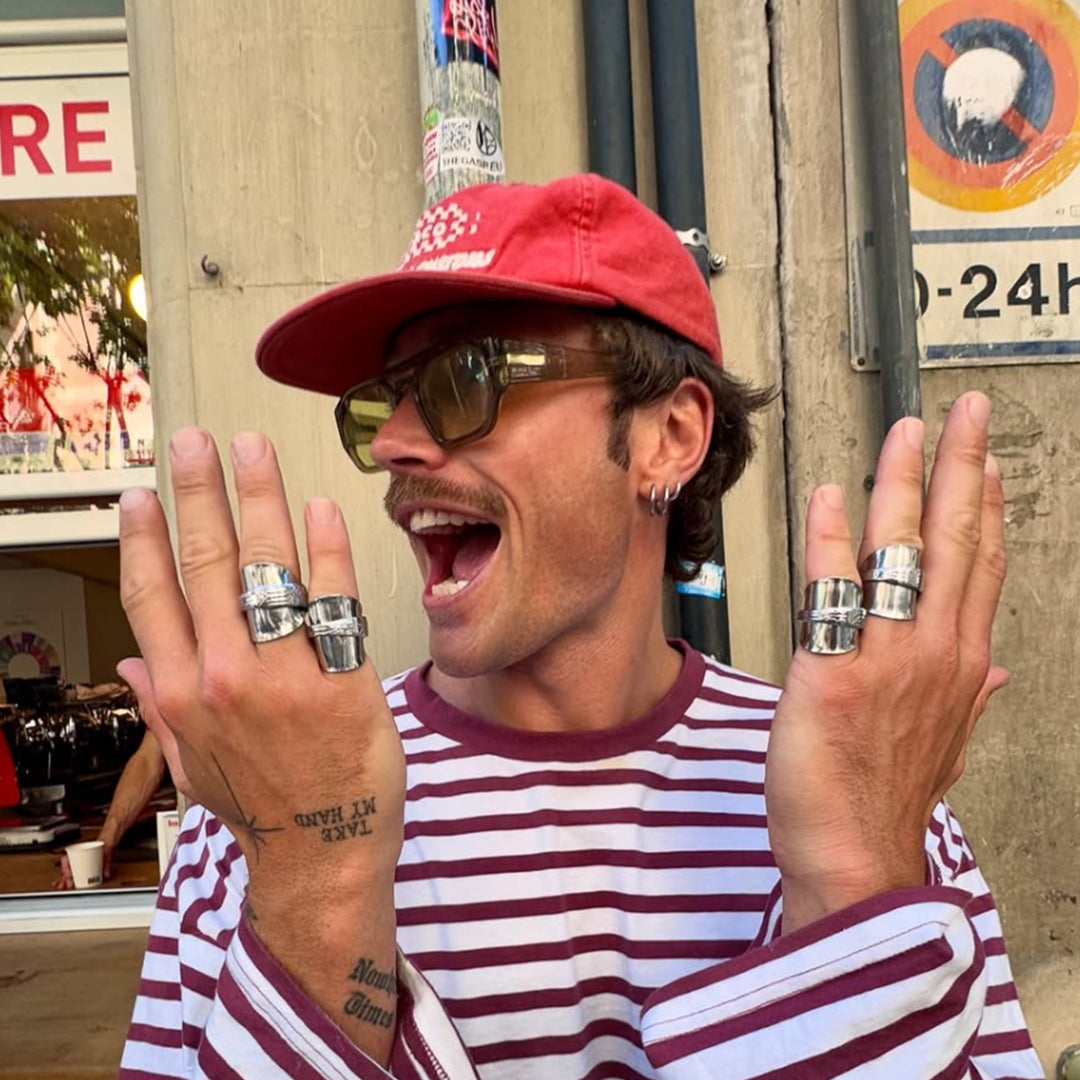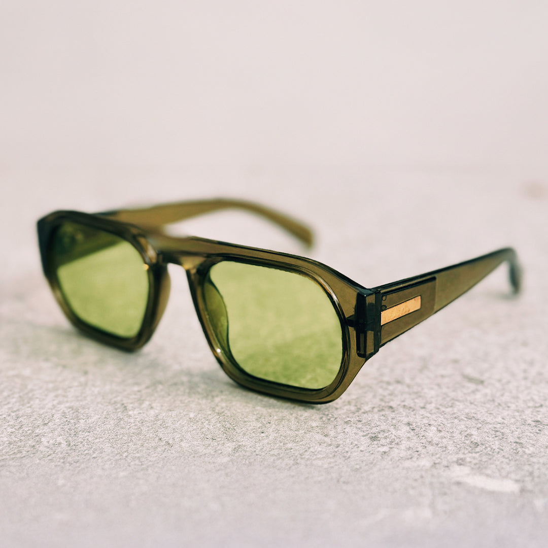 The Retro Sunglasses are a low-key standout: bold, angular frames with an emerald tint that shifts in the light - somewhere between greenhouse green and vintage gold.